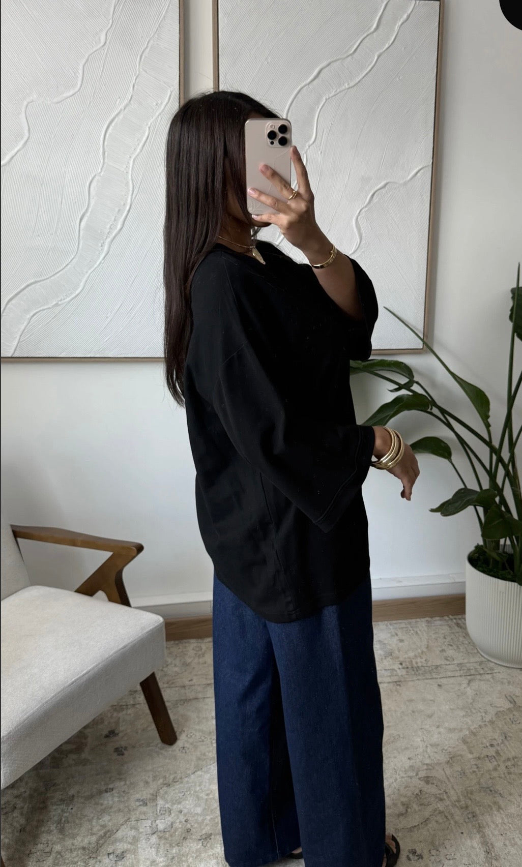 De Dawn Top is een elegante en minimalistische top met een tijdloze uitstraling. De top heeft een losse, comfortabele pasvorm en wijde mouwen, waardoor hij zowel stijlvol als comfortabel te dragen is. Dankzij het eenvoudige en verfijnde design is deze top perfect te combineren met verschillende outfits.