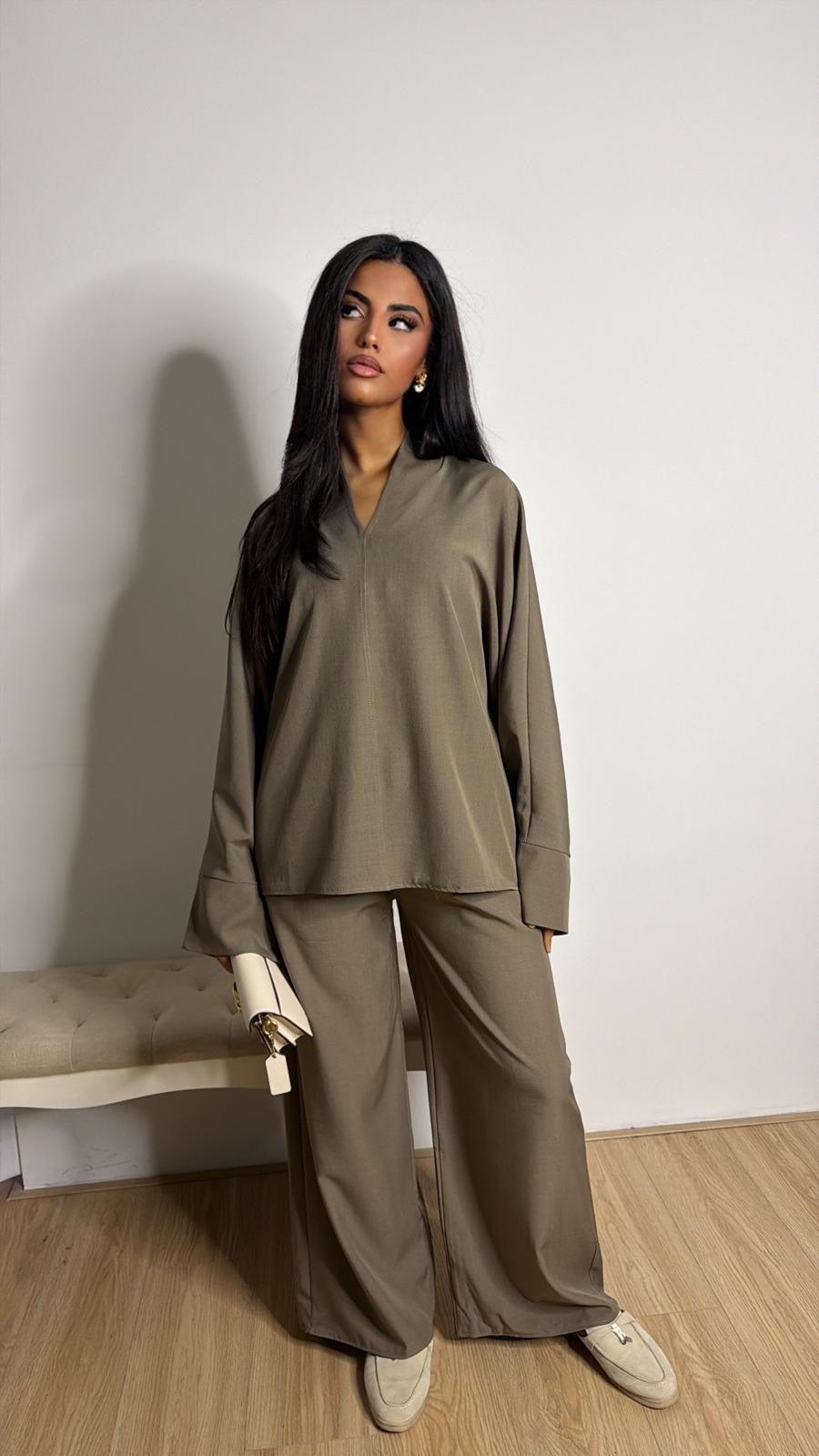 Deze elegante twinset combineert comfort met een minimalistische en stijlvolle uitstraling. De set bestaat uit een losvallende top met lange mouwen en een bijpassende wijde broek, waardoor een moderne en moeiteloze look ontstaat.